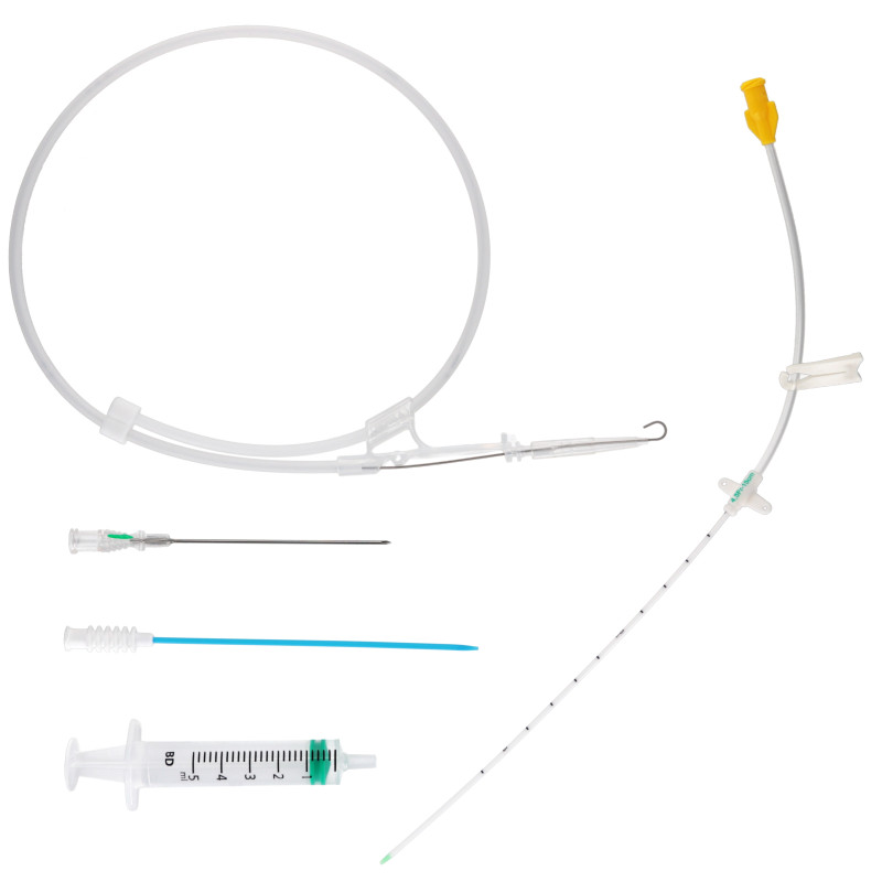 - 1 radiopaque catheter with integrated transparent extension line, centimetric marking, clamp, and flextip. The catheter is depth marked every centimeter, starting at 4cm from the distal tip.
