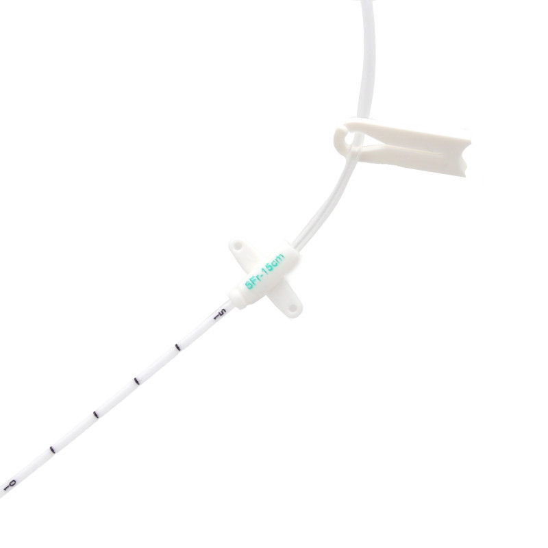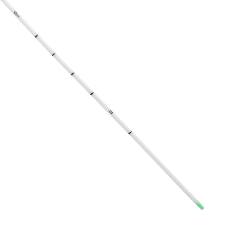 - 1 radiopaque catheter with integrated transparent extension line, centimetric marking, clamp, and flextip. The catheter is depth marked every centimeter, starting at 4cm from the distal tip.