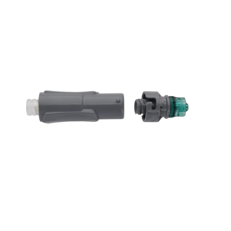 When a Qimomale or a male Luer end is connected onto Qimofemale, the membrane in polyisoprene moves thanks to a metallic spring and opens an internal conduit allowing the injection, infusion, sampling.