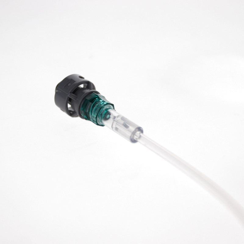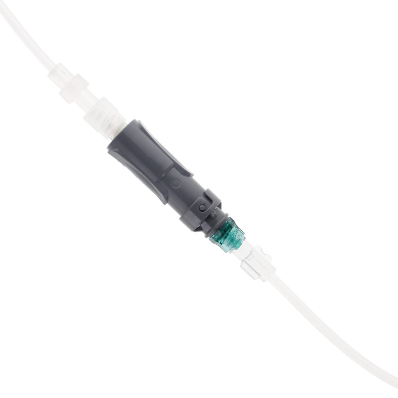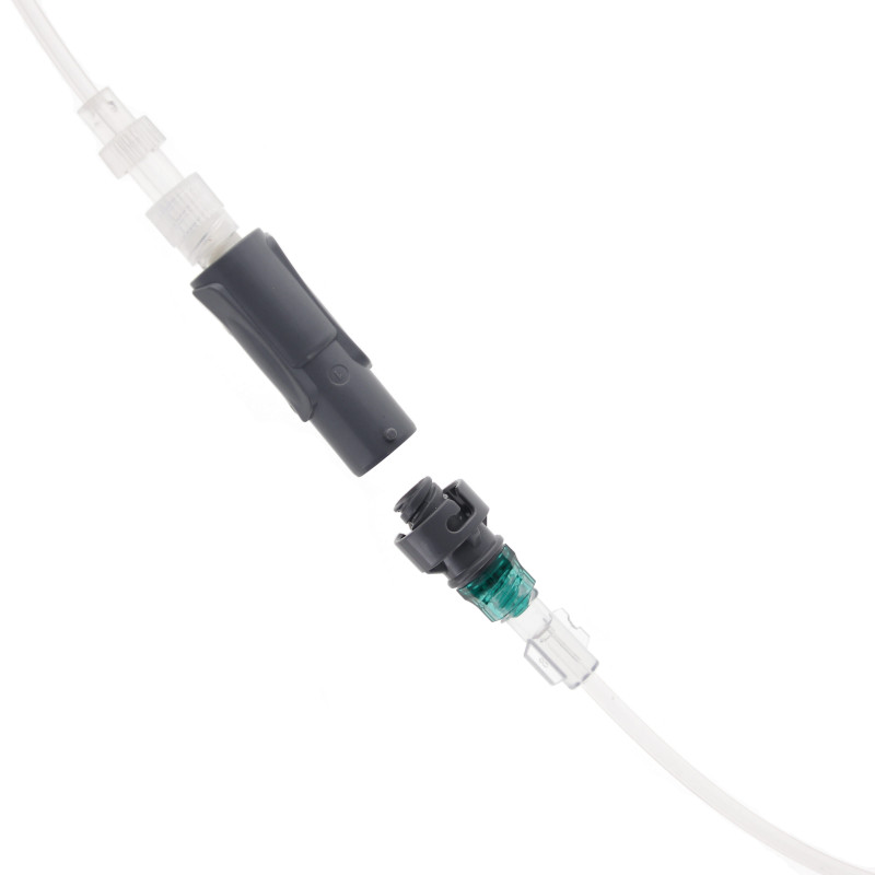 Qimono has a unique bayonet screwless connection and offers a universal access to allow flushing patient vascular access at the end of the infusion